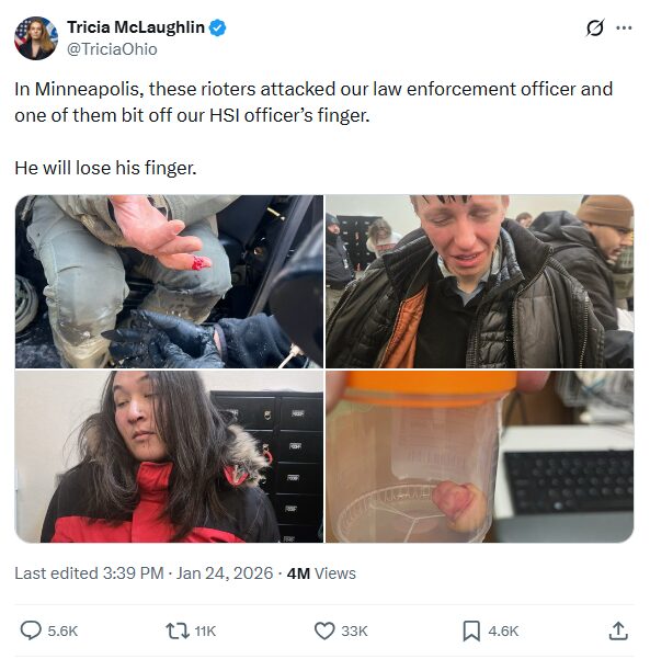 Homeland Security Assistant Secretary Tricia McLaughlin said Saturday that a federal law enforcement officer lost a finger after being attacked by an anti-ICE agitator during ongoing unrest in Minneapolis tied to immigration enforcement operations.