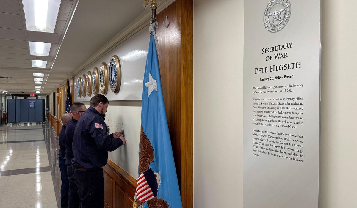 He had employees remove the large gold letters that spelled “Secretary of Defense” outside his office and replaced the sign on his door to read “Secretary of War.” The Pentagon’s website also went from “defense.gov” to “war.gov” the same day the executive order was signed.
