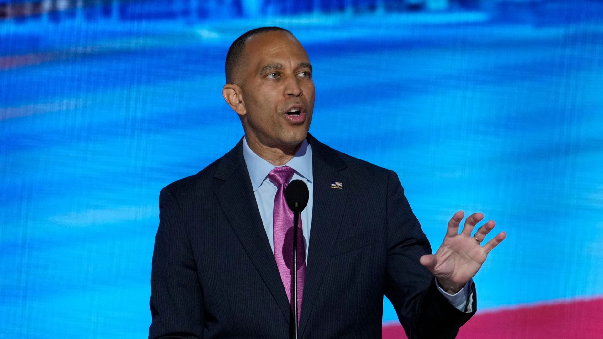 Aug 21, 2024; Chicago, IL, USA; House Minority Leader Hakeem Jeffries, D-N.Y., speaks during the third day of the Democratic National Convention at the United Center. Mandatory Credit: Jasper Colt-USA TODAY