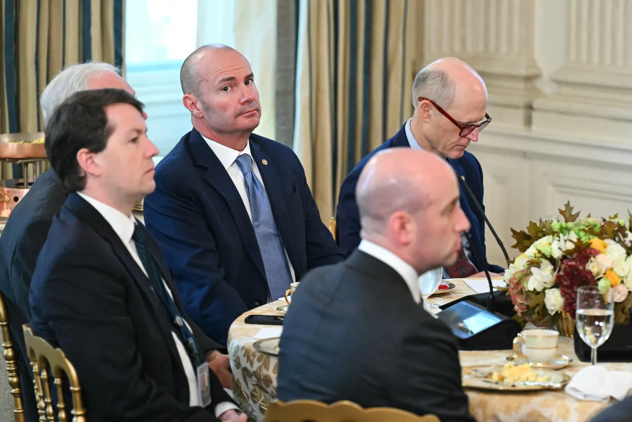US Senator Mike Lee (C), Republican from Utah, listens as US President Donald Trump speaks during a breakfast meeting with Senate Republicans in the State Dining Room of the White House on November 5, 2025, in Washington, DC. (Photo by SAUL LOEB / AFP) (Photo by SAUL LOEB/AFP via Getty Images)