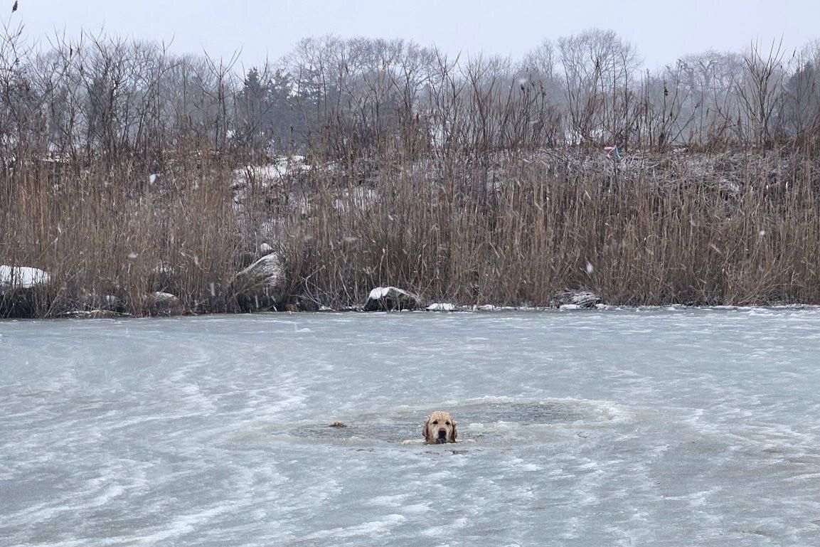 WESTERLY, R.I. — A yellow Labrador out for a walk with his owner in Rhode Island had to be rescued by firefighters on New Year’s Day after he wandered onto a thin layer of ice covering a pond and fell through the center.