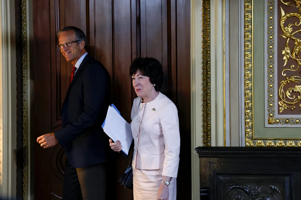 WASHINGTON, DC – JUNE 01: Sen. John Thune (R-SD) and Sen. Susan Collins (R-ME) depart from a luncheon with Senate Republicans at the U.S. Capitol Building on June 01, 2023 in Washington, DC. (Photo by Anna Moneymaker/Getty Images)