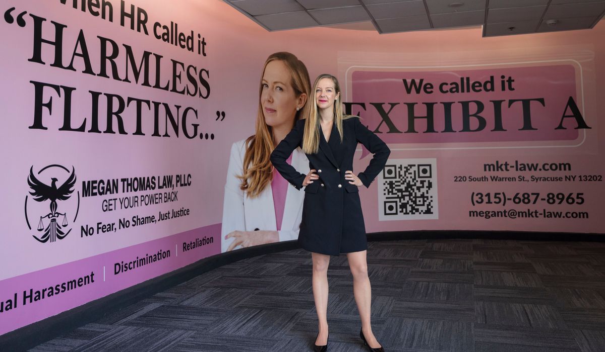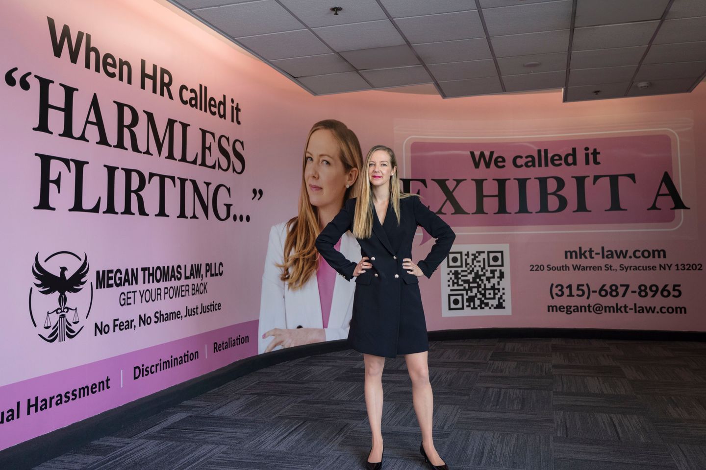 Megan Thomas signed a contract last summer for the ad at Syracuse Hancock International Airport. She wanted it to read: “When HR called it harmless flirting … we called it exhibit A,” but the airport asked her to soften the “harsh” wording.
