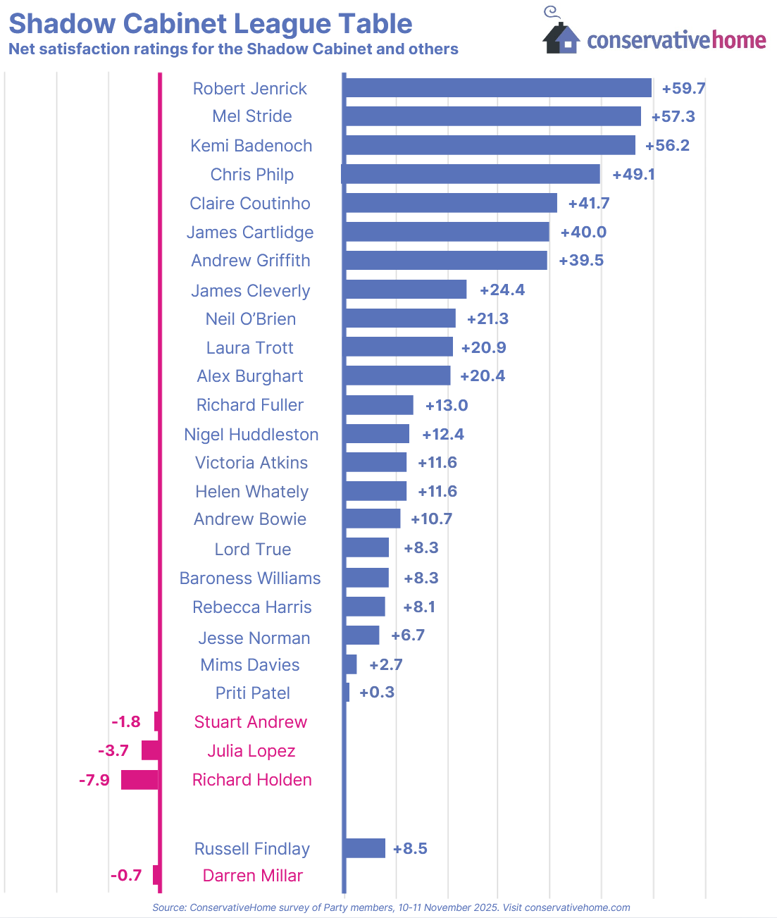 With the economy on everyone’s mind heading into Budget week, the shadow chancellor will be pleased with his personal placing, coming second with a small uplift of +0.6. Labour are set to break their manifesto pledges on tax with a series of U-turns in a Budget by a thousand taxes. It is the Tories’ time to take the mantle, show up the Government and gather some momentum on a key voter issue. That Stride is being noted by members could show the message is at least getting through to the key Tory base.