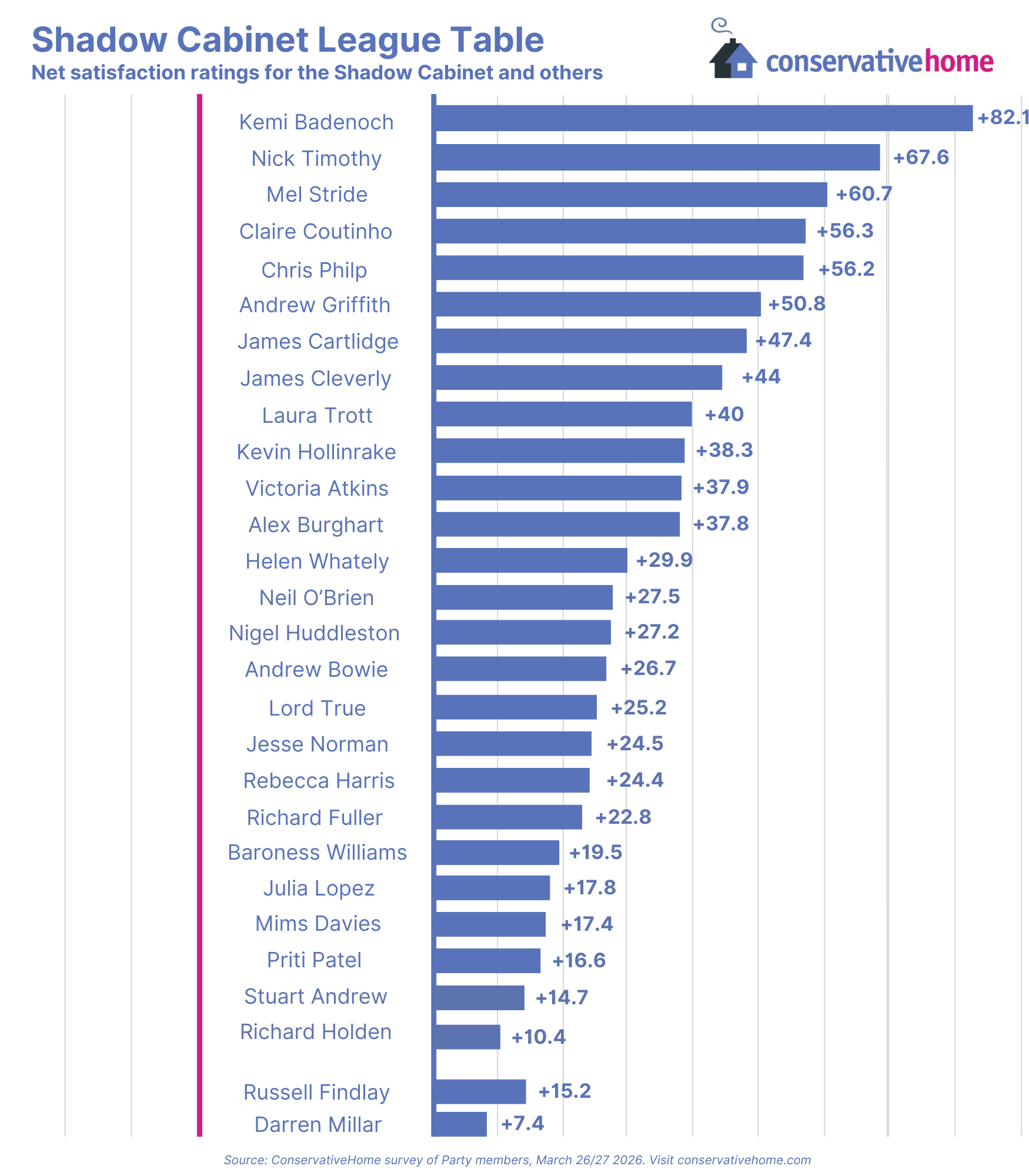 Parliament is in recess, and MPs are once again scattered across the country, back in their constituencies. In North West Essex, Kemi Badenoch will be pleased: once again, she tops ConservativeHome’s Shadow Cabinet League Table, with a net satisfaction rating of +82.1 (up 0.5 points).