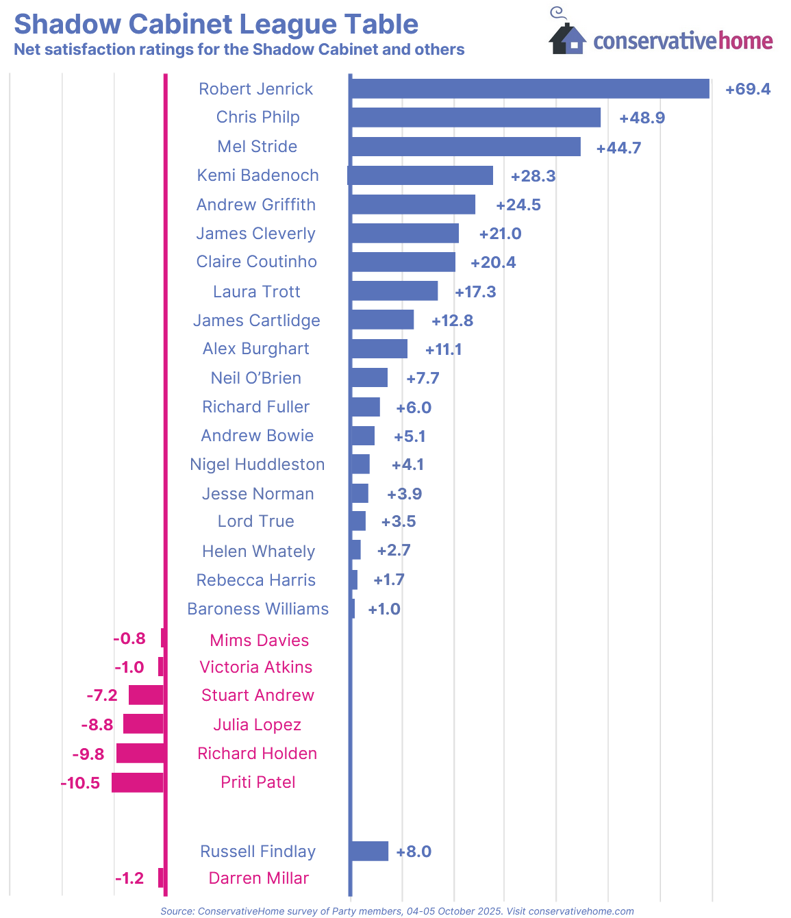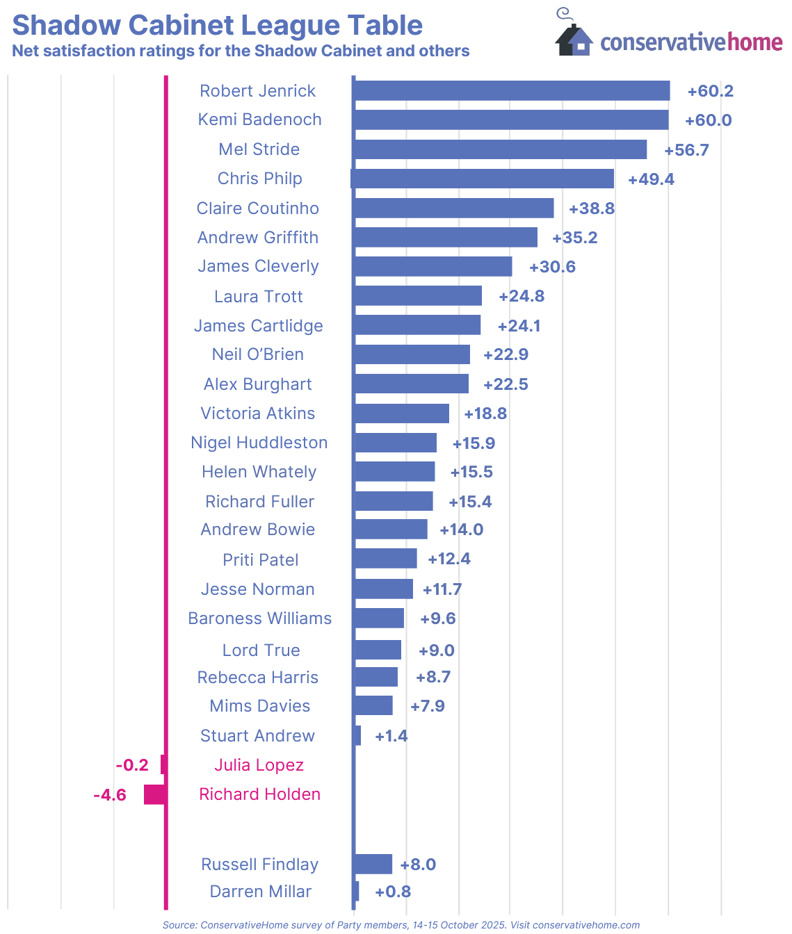 A striking feature of the post-conference table is how few frontbenchers remain in negative territory, Before conference, six figures languished below zero – among them only two, in Shadow Science Secretary Julia Lopez (-0.2) and Shadow Transport Secretary Richard Holden (-4.6), remained after Manchester.
