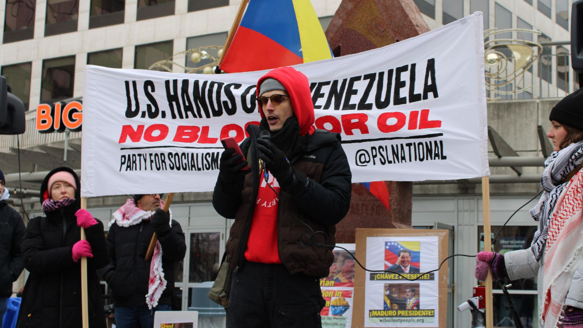 The poster read: “NO WAR ON VENEZUELA! STOP THE BOMBINGS.”