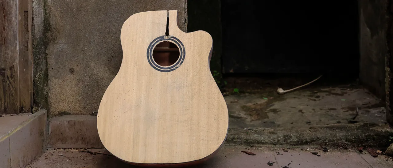 A general view of a guitar made by Clovis Tchoufack (not seen) and displayed in his workshop, in Douala on August 18, 2025. (Photo by Daniel Beloumou Olomo / AFP) (Photo by DANIEL BELOUMOU OLOMO/AFP via Getty Images)