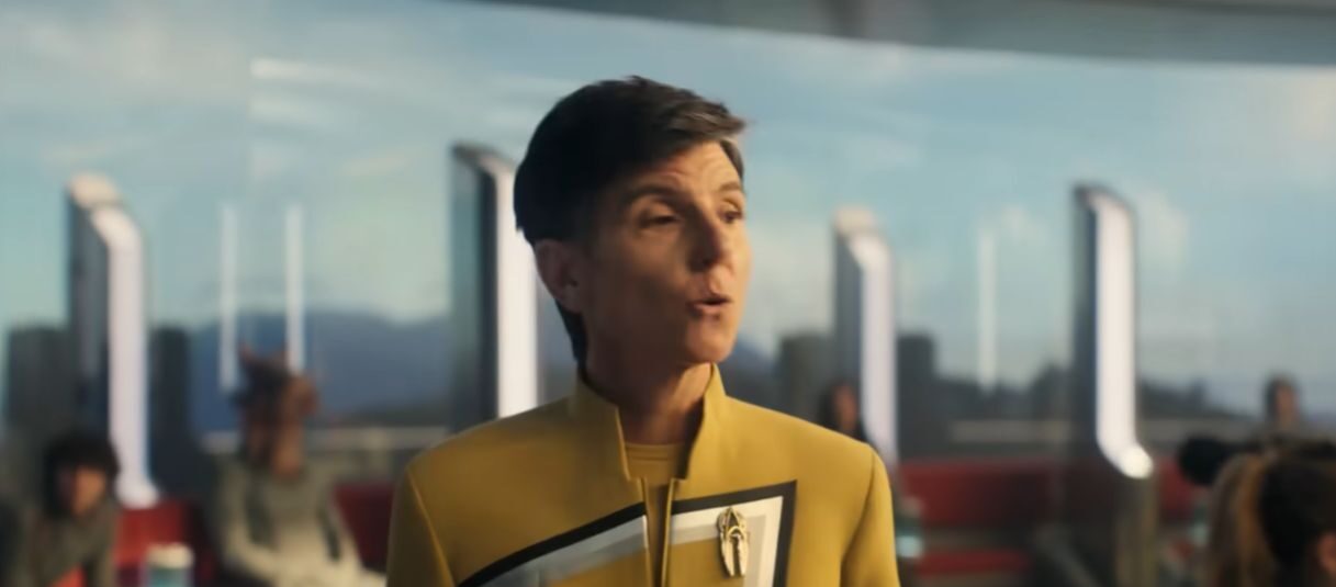 It’s not entirely his fault that the hack feminist writer kept switching his persona from a laughably tough rebel refusing to wear a uniform (What?) — until forced to do pushups by the fat Klingon cadet mistress — to a teary mama’s boy. Caleb then gets one upped by an ugly butch instructress (Tig Notaro), who quotes Oscar Wilde at him, followed by “I love that dude.”