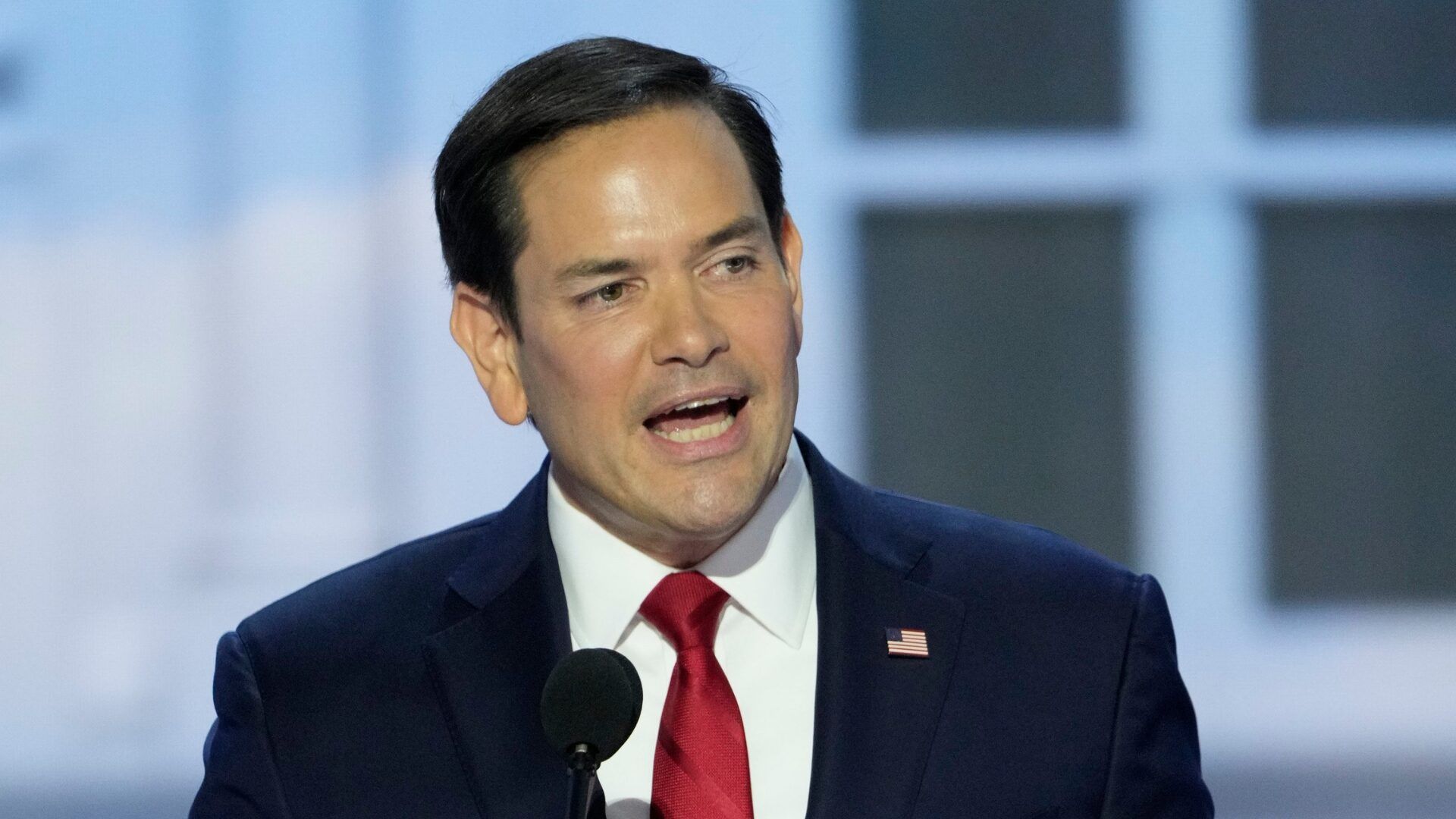 Jul 16, 2024; Milwaukee, WI, USA; Sen. Marco Rubio, R-Fla.delivers remarks during the second day of the Republican National Convention at the Fiserv Forum. The second day of the RNC focused on crime and border policies. Mandatory Credit: Jasper Colt-USA TODAY