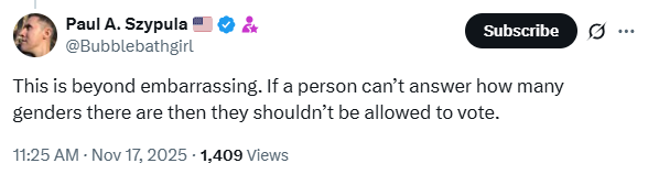 Conservative influencer Paul A. Szypula reacted by posting, “This is beyond embarrassing. If a person can’t answer how many genders there are then they shouldn’t be allowed to vote.”