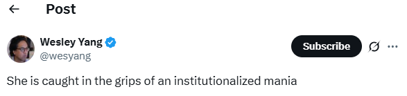 Political commentator Wesley Yang posted, “She is caught in the grips of an institutionalized mania.”
