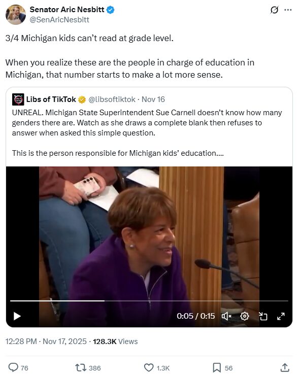Michigan state Sen. Aric Nesbitt posted on X, “3/4 Michigan kids can’t read at grade level. When you realize these are the people in charge of education in Michigan, that number starts to make a lot more sense.”