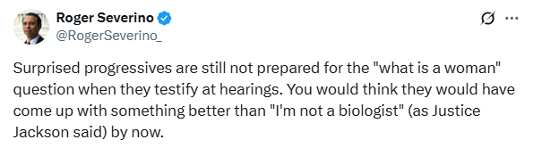 Roger Severino, vice president at the Heritage Foundation, posted, “Surprised progressives are still not prepared for the ‘what is a woman’ question when they testify at hearings. You would think they would have come up with something better than ‘I’m not a biologist’ (as Justice Jackson said) by now.”