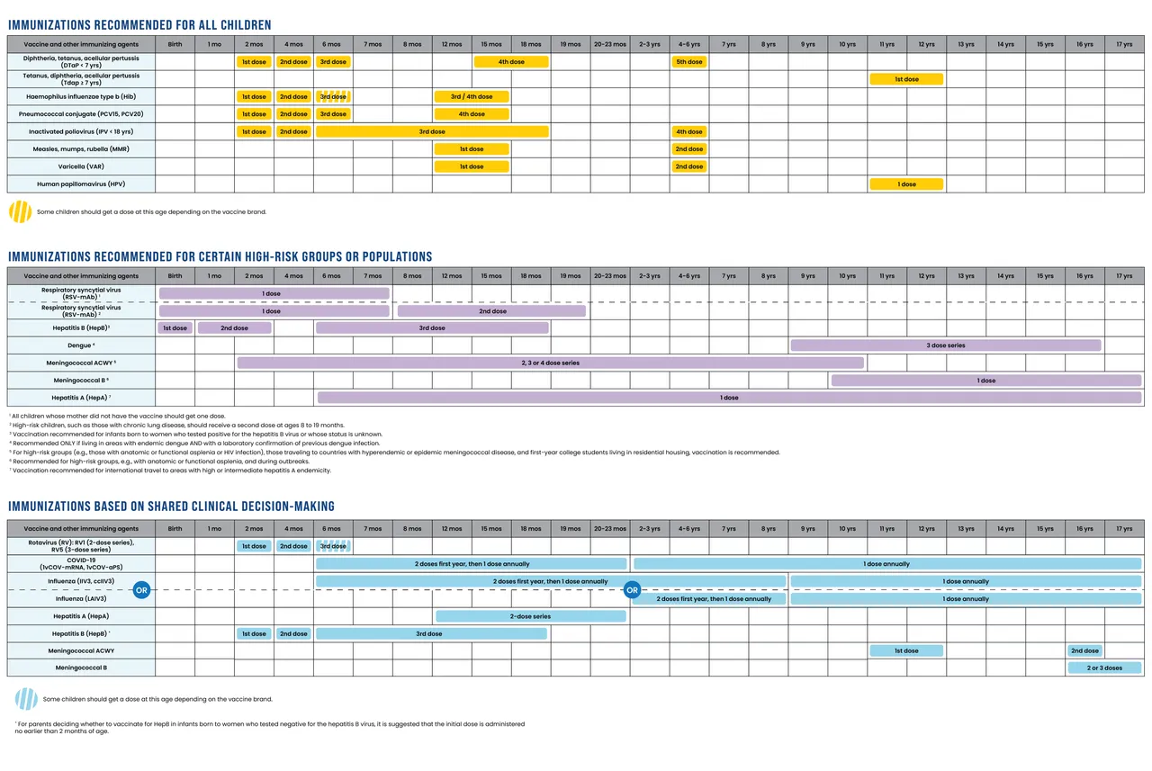 HHS recommends other immunizations for high-risk children, namely respiratory syncytial virus (RSV), hepatitis A, hepatitis B, dengue, meningococcal ACWY, and meningococcal B. They recommended others through shared clinical decision making when it is not possible for public health authorities to clearly define who will benefit from an immunization, namely for rotavirus, COVID-19, influenza, meningococcal disease, hepatitis A, and hepatitis B.