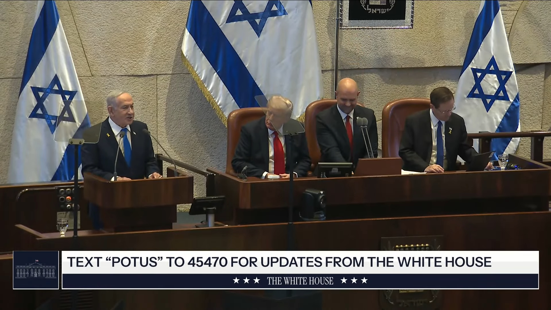 President Trump and his entourage — which included Steve Wikoff, Jared Kushner, Pete Hegseth, Marco Rubio, and others — were escorted into the Knesset by Netanyahu, Israeli President Isaac Herzog, and Knesset Speaker Amir Ohana. In a photographic moment, Trump whipped out a thick black marker and inscribed “This is my great honor — a great and beautiful day. A new Beginning,” in the Knesset guestbook.
