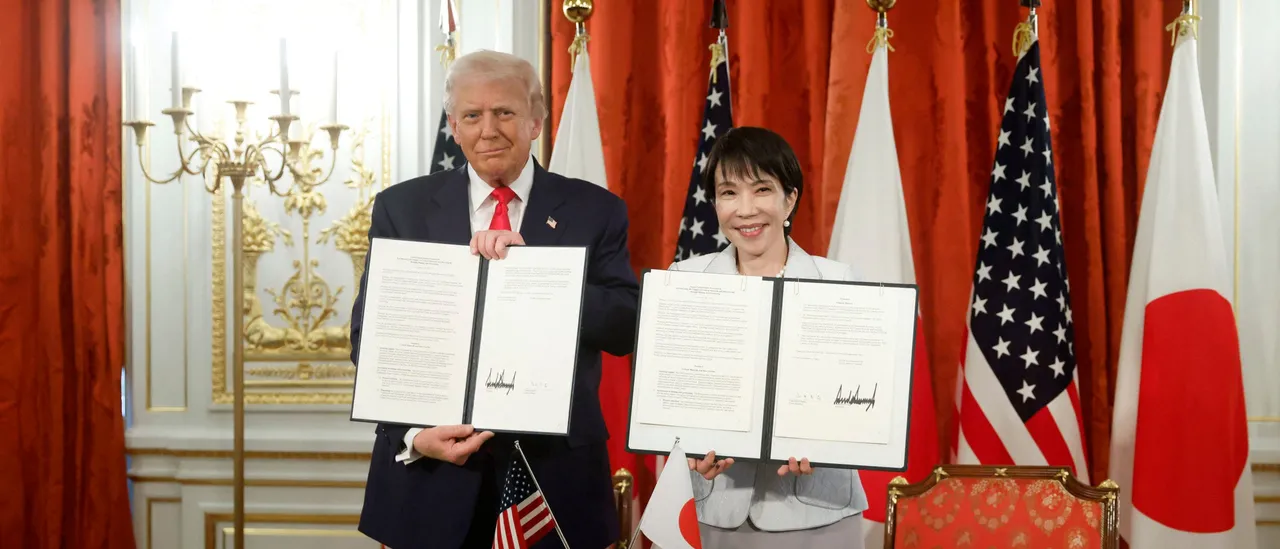 Japan’s Prime Minister Sanae Takaichi (R) and US President Donald Trump attend a signing ceremony after a Japan-US Summit at the Akasaka State Guest House in Tokyo on October 28, 2025. (Photo by ANDREW CABALLERO-REYNOLDS/AFP via Getty Images)