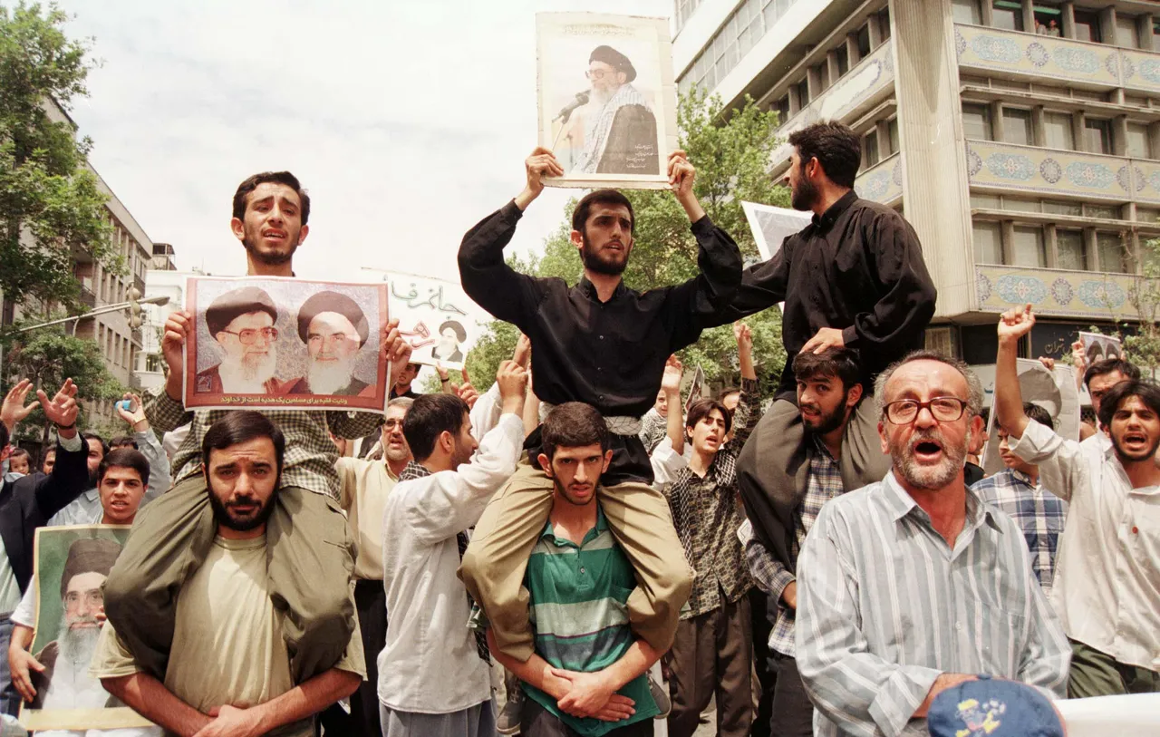 Men on a pro-leader demonstration in Tehran, in support of Ayatollah Ali Khamenei, after the city’s student riots, 14th July 1999. The riots caused huge unrest between reformists and hardliners. (Photo: Kaveh Kazemi/Getty Images)