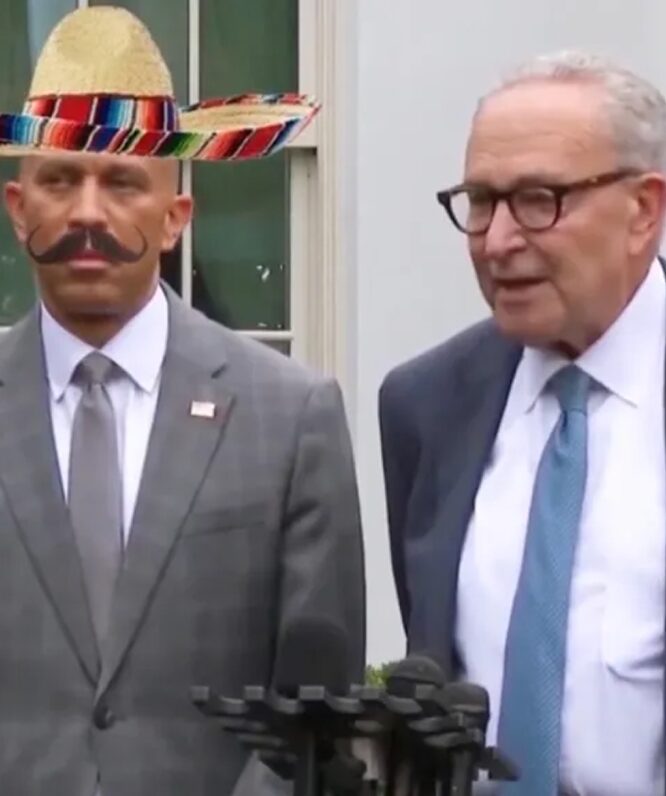 Under “The Democrats,” the page displays a photo of Senator Schumer standing next to Representative Jeffries, both edited to appear in sombreros and fake handlebar mustaches.