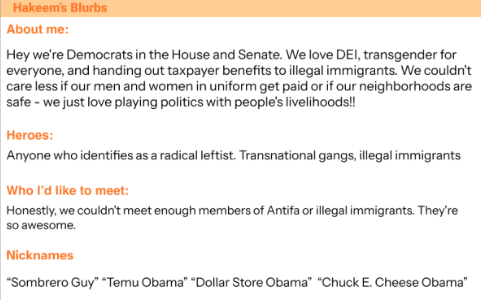 It reads: “Hey we’re Democrats in the House and Senate. We love DEI, transgender for everyone, and handing out taxpayer benefits to illegal immigrants. We couldn’t care less if our men and women in uniform get paid or if our neighborhoods are safe — we just love playing politic with people’s livelihoods!”