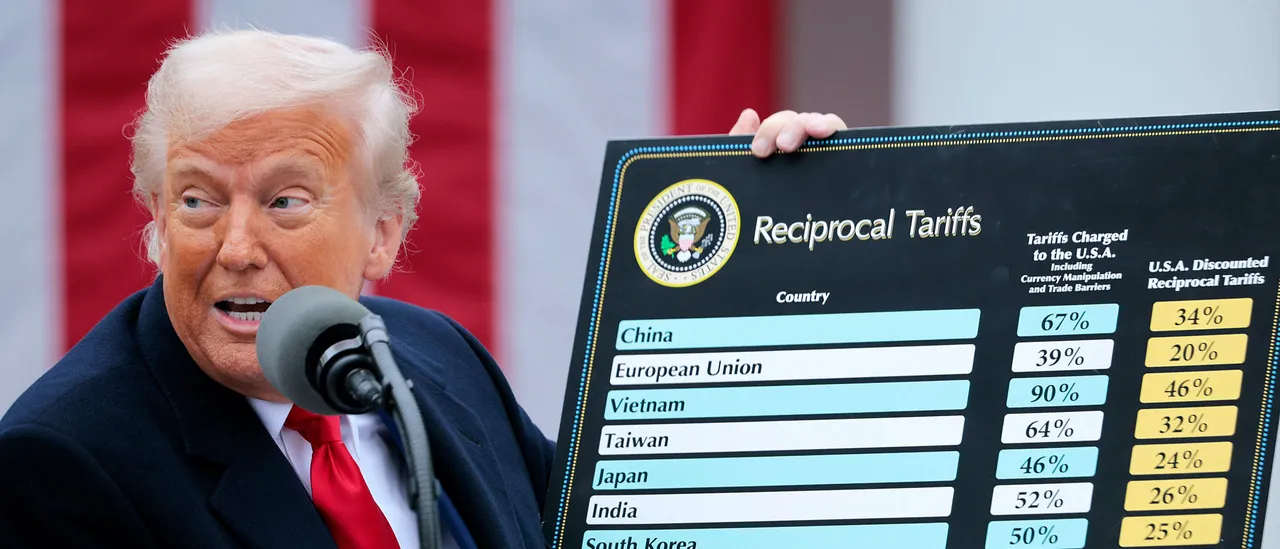 TOPSHOT – US President Donald Trump holds a chart as he delivers remarks on reciprocal tariffs during an event in the Rose Garden entitled “Make America Wealthy Again” at the White House in Washington, DC, on April 2, 2025. (Photo by Brendan SMIALOWSKI / AFP) (Photo by BRENDAN SMIALOWSKI/AFP via Getty Images)