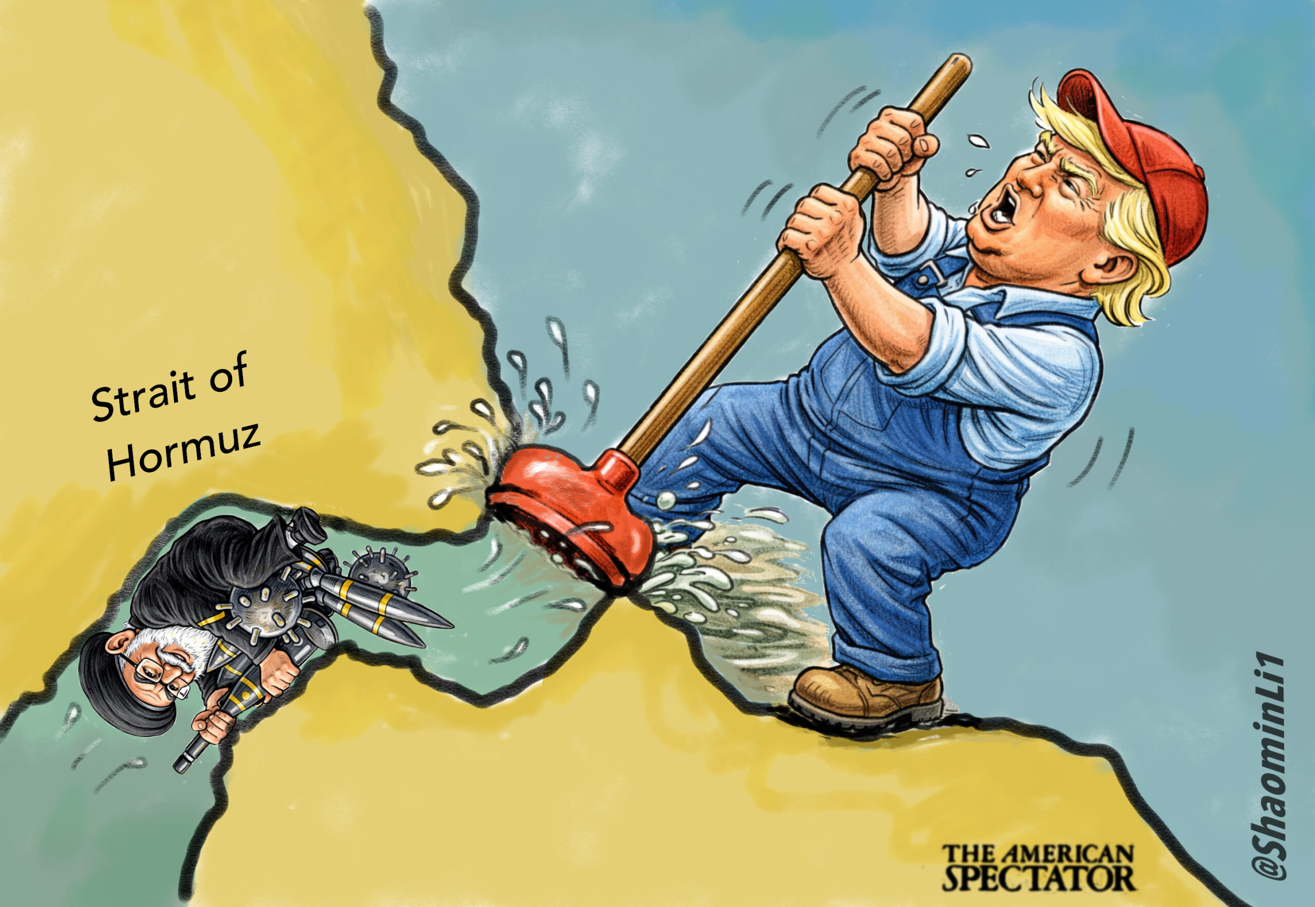 “Unclogging Hormuz,” editorial cartoon by Shaomin Li for The American Spectator on April 1, 2026.