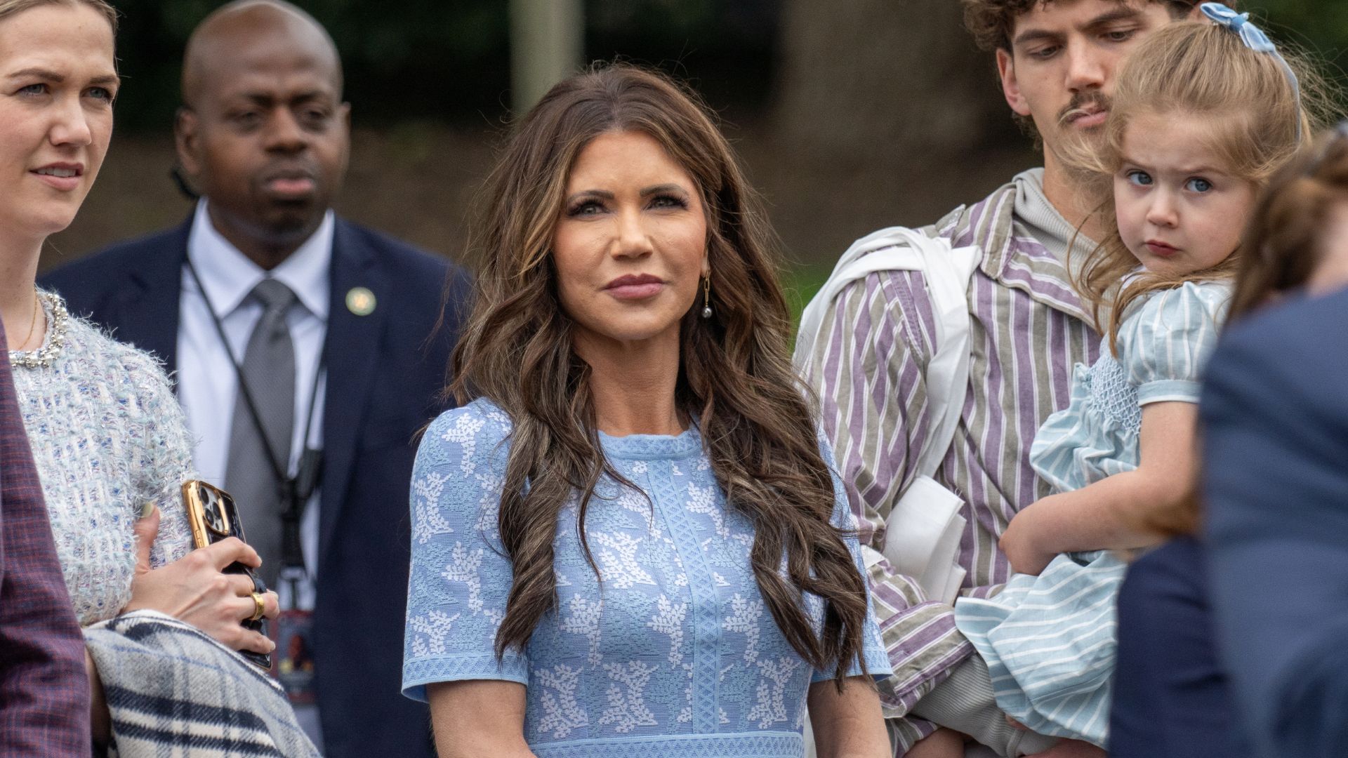 Outside the room, Noem was approached by reporters and surrounded by protesters while holding her grandchild.