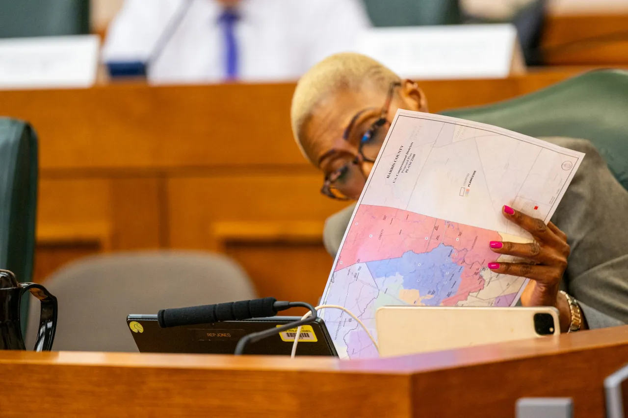 AUSTIN, TEXAS – AUGUST 01: U.S. Rep. Jolanda Jones (D-TX) looks at a map during the Texas State Representatives redistricting committee meeting on August 01, 2025 in Austin, Texas. The House Select committee on Congressional Redistricting holds its first hearing since Texas Republicans redrew their congressional map (Photo by Brandon Bell/Getty Images)