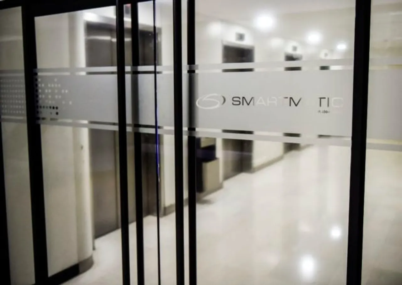 Picture of the logo of Smartmatic, the firm that supplies Venezuela’s voting technology, seen on a sliding door at the headquarters of the company in Caracas, on August 2, 2017. (Photo by RONALDO SCHEMIDT/AFP via Getty Images)